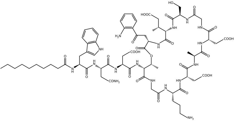 Keywords: Daptomycin.svg Chemical structure of the drug Daptomycin Chemical formula C<sub>72</sub>H<sub>101</sub>N<sub>17</sub>O<sub>26</sub> self-made Inkscape 2008-04-23 Inductiveload Daptomycin