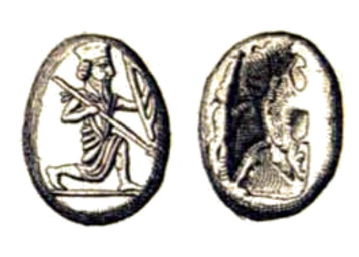 | Keywords: Dareik.png de Ein persische Daricus nl Een Perzische Dareik en See also File C+B-Shekel-FigA-PersianDaric PNG for a tracing of the image http //susi e-technik uni-ulm de 8080/Meyers2/seite/bild/werk/meyers/band/11/seite/0897a/meyers_b11_s0897a html Meyers Konversations-Lexikon 1885-1892 PD-old Daric Spears on coins Bows on coins Soldiers on coins |