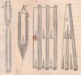 Keywords: Das Kürschner-Handwerk, II. Auflage 3. Teil, S. 26. Schweife.jpg Zobelschweifen Früher wurden mehr als heutzutage grössere Gegenstände aus Zobelschweifen hergestellt Besonders in der Zeit zwischen 1830 bis 1890 und hauptsächlich in und für England wurden Muffen Boas Etole Besätze Pelerinen ja ganze Mäntel aus Schweifen gefertigt Das Princip dieser Arbeiten ist einfach benötigt aber ein sehr sorgfältiges gutes Sortiment Die Schweife werden gestreckt das Wilde der Wurzel und die Spitze soweit das Haar zu lang ist abgeschlagen Dann werden die Schweife sortiert und auf eine gleichmässige Länge gebracht Dann wird jeder Schweif durch galonieren auf die notwendige Breite gestellt Je nach Bedarf und der Rauche angemessen werden die Spitzen mehr oder weniger sei es mit schwarzem Sämischleder sei es mit gutem Seidenband galoniert Fig K zeigt den Schweif vorbereitet Daneben den Anfang eines Muffblattes oder einer Garnitur die oben so breit wie unten ist Zwischen jeden Schnitt ist eine Seidengalone genäht Gewöhnlich setzt man die einzelnen Schweife erst zu Stössen zu einander bis die notwendige Höhe erreicht ist K 2 zeigt ein Beispiel wenn der zu machende Gegenstand oben schmäler wie unten ist Im Allgemeinen wird durch ein entsprechendes galonieren die Form mehr oder weniger verändert Angewendet werden fast ausschliesslich Seidengalonen Die Herstellung von grösseren Boas kann auf zweierlei Art geschehen Die Schweife können ganz bleiben 4-8 je nach der notwendigen Staerke des Boas nebeneinander gesetzt und nur schwach galoniert Dann die einzelnen Stösse aufeinander bis die Länge erreicht ist; als Abschluss die Spitzen der Schweife Da diese Arbeitsweise aber keine schöne runde Form ergiebt wenn sie auch die praktischste ist so hat man eine compliciertere Verarbeitung gefunden um auch in dieser Hinsicht einen besseren Effekt zu erzielen Das zu verwendende Material muss aber möglichst in Farbe und Rauche passen Die Schweife werden gut in die Breite gestreckt und dann quer in ½ ctm breite Streifen geschnitten Sind alle Schweife auf diese Weise vorbereitet werden die einzelnen Schnitte in einander versetzt Man beginnt mit den Spitzen indem die rauchsten an des Ende zu stehen kommen Das Zusammennähen der Querstreifen soll mit guter starker Seide geschehen und der Faden ohne Ende sich durch das ganze Band hindurchziehen da er die Haltbarkeit der Boas erhöht Ist der Streifen fertig wird er probeweise auf einen Stab gedreht um etwaige Fehler in Farbe und Rauche ausbessern zu können Die Stärke des Stabes muss der Rauche des Bandes angepasst sein oben stark und nach unten zu schwächer werden Auf diesen Stab wird ein Streifen aus Atlass mit Zwirn befestigt Siehe Abbildung und Beschreibung Hilfsmittel Dann wird über diesen Stock aufgelöster Kautschuk gestrichen und der Boa darauf gedreht Nach dem Trockenen wird der Stab herausgezogen und durch eine Füllung aus Wolle ersetzt Bänder werden meist nur aus einer Schweifbreite hergestellt und sind ein vorzügliches Garnierungsmittel für die verschiedensten Gegenstände Der Schweif auf diese Weise verarbeitet behällt seine natürliche Schönheit das Spielen des Haares Fig H zeigt einen Schweif an dem das Wilde der Wurzel und die äusserste Spitze abgeschlagen wurde Fig I mehrere Schweife aufeinandergesetzt Paul Larisch und Josef Schmid Das Kürschner-Handwerk Eine gewerbliche Monographie II Auflage III Teil 1910 S 26 1910 Larisch/Schmid PD-old Das Kürschner-Handwerk Paul Larisch und Joseph Schmid II Auflage III S 26 Fur-tail manufacturing |