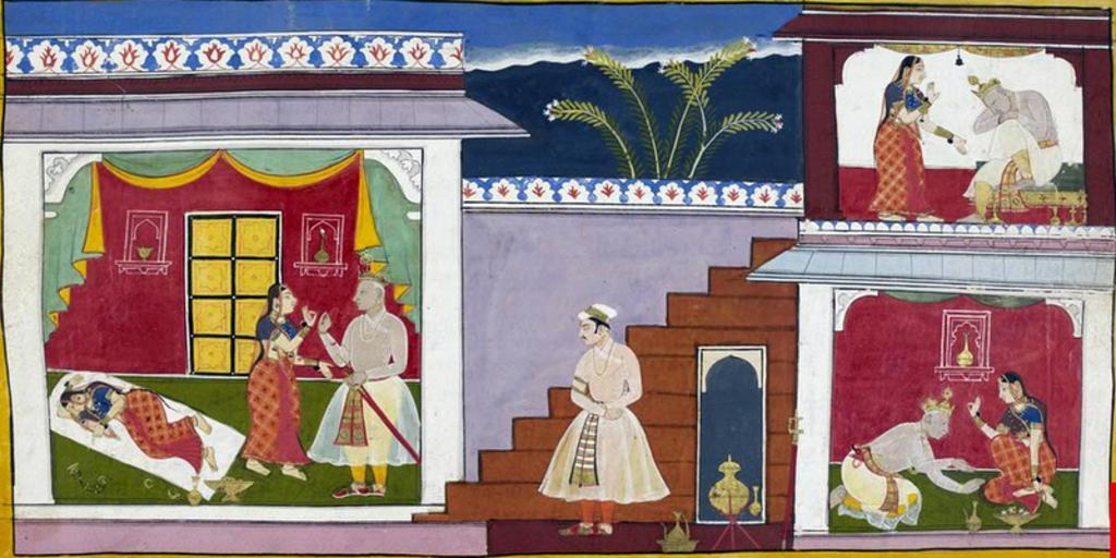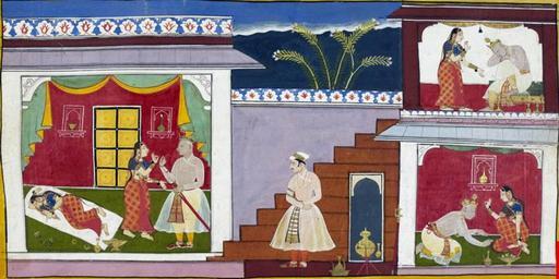 Keywords: Dasaratha promises to banish Rama per Kaikeyi's wishes.jpg en In the second book the Book of Ayodhya Ayodhya Kand Kaikeyi has become jealous of Rama as his father has announced that he is to be installed as regent In this picture she is first seen on the left lying on the ground in a dishevelled and angry state having stripped herself of her ornaments Dasaratha is overcome at the sight of her and promises to do anything she wants to appease her She rises from the ground to demand that her son Bharata be promised the throne and Rama be exiled for fourteen years Rama was less than sixteen years old at this time On the right Dasaratha is first seen bemused seated on a couch as he listens to Kaikeyi's demands and then below kneeling at her feet beseeching her to change her mind The action revolves around the still figure of the minister Sumantra who makes a pictorial link with the next episode since he is sent by the Brahmins to awaken the king to begin the consecration of Rama as regent http //www bl uk/onlinegallery/ttp/ramayana/accessible/pages3and4 html content British Museum online gallery p 4 author century 17 Public Domain PD-art Kaikeyi Paintings of Ramayana Dasaratha Art of India in the British Library 17th-century paintings from India Illuminated manuscripts created in India |