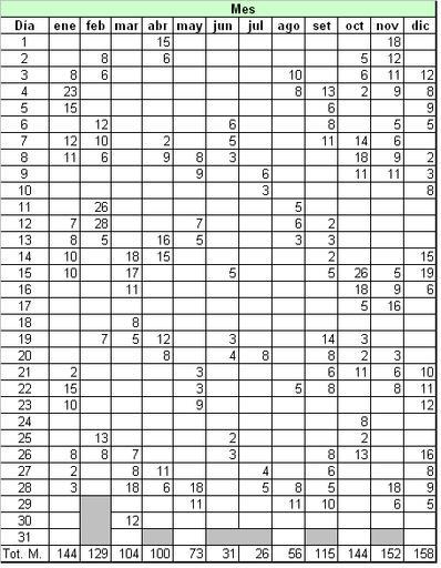 Keywords: Datos diarios de lluvia.PNG Ejemplo de datos diarios de precipitaciones en una estación hipotética 2006-01-12 own assumed Alfredobi Data tables Weather observations