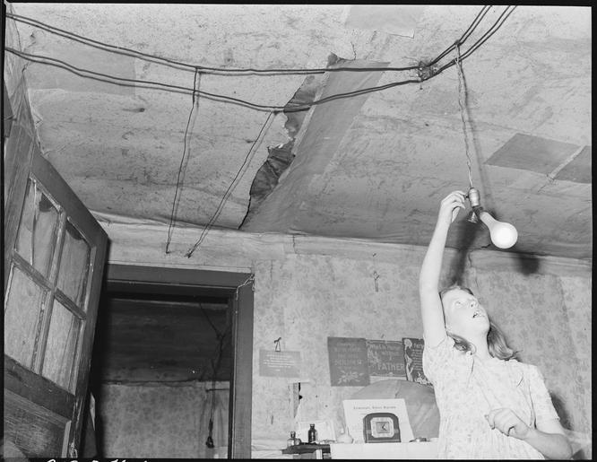 | Keywords: Daughter of Gillie Treadway, a miner, turning on the elecrtic light in their house - NARA - 541160.tif Scope and content Daughter of Gillie Treadway a miner turning on the elecrtic light in their house There is no protection from fire in this camp; the nearest fire fighting equipment is in Pineville about seven miles away; water for fire fighting must be pumped from the meager stream; the only telephone in the camp is in the store which is locked and no key is kept in the camp during the night Houses usually burn to the ground within twenty minutes after the fire gets going Notice the wiring Fox Ridge Mining Company Inc Hanby Mine Arjay Bell County Kentucky General notes 541160 Local identifier 245-MS-2176L Department of the Interior Solid Fuels Administration For War 04/19/1943 - 06/30/1947 NARA-Author Lee Russell 1903-1986 Photographer 2489414 <br /> Still Picture Records Section Special Media Archives Services Division NWCS-S National Archives at College Park 8601 Adelphi Road College Park MD 20740-6001 1946-08-31 Record group Record Group 245 Records of the Solid Fuels Administration for War 1937 - 1948 Record group ARC 572 Photographs of the Medical Survey of the Bituminous Coal Industry compiled 1946 - 1947 Series ARC 540230 File unit File unit ARC Variant control numbers NAIL Control Number NWDNS-245-MS-2176L yes Other versions <gallery> File Daughter_of_Gillie_Treadway _a_miner _turning_on_the_elecrtic_light_in_their_house_-_NARA_-_541160 tif tif File Daughter_of_Gillie_Treadway _a_miner _turning_on_the_elecrtic_light_in_their_house_-_NARA_-_541160 jpg jpg </gallery> NARA-cooperation PD-USGov Coal mining in the United States NARA TIF images with categorized JPGs |