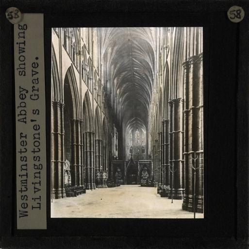 | Keywords: David Livingstone's Grave, Westminster Abbey, England, ca. 1873 (imp-cswc-GB-237-CSWC47-LS16-058).jpg en <br> David Livingstone's Grave Westminster Abbey England ca 1873 Photograph of Westminster Abbey showing the grave of David Livingstone Livingstone died in 1873 in a village at Ilala southeast of Lake Bangweulu in North-Western Rhodesia from malaria Livingstone's heart was buried here under a Mvula tree His body was carried by his loyal attendants Chuma and Susi over a thousand miles to the coast and was returned to Britain for burial ; This belongs to a series of Church of Scotland Foreign Missions Committee lantern slides relating to David Livingstone 1813-1873 the Scottish missionary who was best known as an explorer of Africa and anti-slavery campaigner Livingstone was born in Blantyre Scotland and after working in the local cotton mill from the age of 10 he went on to study medicine and theology in Glasgow in 1836 Having decided to become a missionary he was posted to southern Africa in 1841 In 1845 he married Mary Moffat During his life Livingstone carried out exploration of southern eastern and central Africa he discovered and named the Victoria Falls and it was his meeting with H M Stanley during a search for the source of the Nile that gave rise to the popular quotation Dr Livingstone I presume David Livingstone died in Africa on 1 May 1873 and his body was buried in Westminster Abbey Photographer Unknown Subject personal name Livingstone David 1813-1873 Filename imp-cswc-GB-237-CSWC47-LS16-058 tif Coverage date after 1873 Part of collection International Mission Photography Archive ca 1860-ca 1960 Type images Part of subcollection Photographs from the Centre for the Study of World Christianity University of Edinburgh U K ca 1900-ca 1940s Repository name Centre for the Study of World Christianity Archival file impaunpub_Volume7/1891 url Repository address The University of Edinburgh School of Divinity New College Mound Place Edinburgh EH1 2LX United Kingdom Geographic subject country Zambia Format aacr2 1 lantern slide 8 x 8 cm Geographic subject continent Africa Rights Contact the repository for details Part of series David Livingstone LS16 Repository email divinity-CSWC ed ac uk Subject lcsh Keyword Memorials Date created circa 1875/1940 Publisher of the digital version University of Southern California Libraries Subject aat genre interior views Format aat lantern slides Legacy record ID impa-m69474 Access conditions http //www ed ac uk/schools-departments/divinity/research/centres/world-christianity/collections-resources File GB 237 CSWC47/LS16/58 circa 1875 /1940 author http //digitallibrary usc edu/cdm/ref/collection/p15799coll123/id/65007 PD-old-70-1923 Magic lantern images Images from USC Digital Library uploaded by Fæ International Mission Photography Archive ca 1860-ca 1960 David Livingstone IMPA Westminster Abbey |