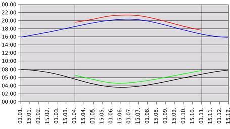 Keywords: Daylight Saving Time.svg Daylight Saving Time Sommerzeit Sonnenaufgangs- und Untergangszeiten bei Normalzeit und Sommerzeit; The chart plots the clock times with DST adjustment as separate lines of sunrise and sunset in Greenwich England for 2007 Own 2008-04 Werneuchen Daylight saving time