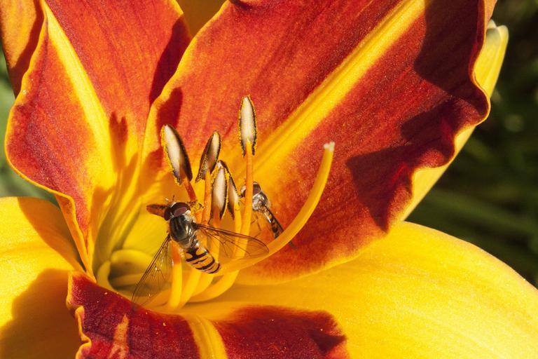 Keywords: daylily hemerocallis day lily flower flower plant nature summer orange yellow brown red macro stamp stamens hoverfly nectar