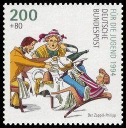 | Keywords: DBP 1994 1730 Zappel-Philipp.jpg For the youth 100th day of death of Heinrich Hoffmann Writer Für die Jugend 100 Todestag von Heinrich Hoffmann Autor Graphics by Ehmke Ausgabepreis 200+80 Pfennig First Day of Issue / Erstausgabetag 14 April 1994 Michel-Katalog-Nr 1730 scanned by NobbiP 2011-01-16 creator Heinrich Hoffmann writer PD-old-100 <gallery> File DBP 1994 1726 Paulinchen jpg Paulinchen File DBP 1994 1727 Hanns Guck-in-die-Luft jpg Hanns Guck-in-die-Luft File DBP 1994 1728 Struwwelpeter jpg Struwwelpeter File DBP 1994 1729 Der böse Friederich jpg Der böse Friederich </gallery> Philately Zappel-Philipp Nennwert 200+80 Pfennig 1994-04-14 Ehmke 2 945 000 Offsetdruck 1730 1994 stamps of Germany 1730 Children's literature on stamps Jugendmarken Reception of Struwwelpeter Attention Deficit Hyperactivity Disorder German stamps review keep |