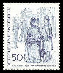 Keywords: DBPB 1969 337 Christian Wilhelm Allers Am Brandenburger Tor.jpg People of Berlin of the 19th century Berliner des 19 Jahrhunderts Dargestellt ist der Schriftsteller Julius Stinde im Gespräch mit seinen Romanfiguren Frau Buchholzen und deren Tochter <ref>Landespostdirektion Berlin Rundschreiben 6/1968</ref> Graphics by Finke Ausgabepreis 50 Pfennig First Day of Issue / Erstausgabetag 26 März 1969 Michel-Katalog-Nr 337 Berlin scanned by NobbiP 2009-01 Creator Christian Wilhelm Allers 1915 PD-text <gallery> File DBPB 1969 330 Heinrich Zille Droschkenkutscher jpg File DBPB 1969 331 Christian Wilhelm Allers Zeitungsverkäufer jpg File DBPB 1969 332 Christian Wilhelm Allers Pferdeomnibus jpg File DBPB 1969 333 Franz Krüger Schusterjunge jpg File DBPB 1969 334 Adolph von Menzel Schuster jpg File DBPB 1969 335 Paul Meyerheim Borsig-Schmiede jpg File DBPB 1969 336 Franz Krüger Berlinerinnen jpg </gallery> Philately Am Brandenburger Tor von Christian Wilhelm Allers Nennwert 50 Pfennig 1969-03-26 Finke 4 620 000 Stichtiefdruck 337 Berlin See also <gallery> File Allers Spree Berlin Brandenburger Tor jpg zugrunde liegende Zeichnung von C W Allers </gallery> References <references/> Drawings on stamps of Germany 1969 Deutsche Bundespost Berlin stamps 337 Christian Wilhelm Allers Brandenburg Gate 19th century Brandenburg Gate on stamps Groups of people on stamps 1889 in Berlin Julius Stinde Spreeathener Allers German stamps review keep