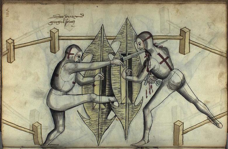 | Keywords: De Alte Armatur und Ringkunst Talhofer 207.jpg der trit und gurgel stich a kick and thrust to the throat i e a kick with the right leg to the right side of the opponent's shield has the effect of displacing the shield rotating it along the axis of its vertical handle At the same time the sword is thrust into the opening so created on the opponent's left side aiming for the throat 206 208 Cod 10799 Men with swords in art | ||||