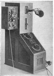 Keywords: De Forest 1909 arc radiotelephone.jpg two-way AM radiotelephone set developed in 1907-09 by Lee De Forest This was before the development of amplifying vacuum tubes and the device used an arc converter a high voltage electric arc in an alcohol flame attached to a tuned circuit to generate radio waves The receiver box on left side used an early version of his Audion tube detector This was a civilian version of the radiotelephone sets which De Forest installed on the U S Navy great white fleet which were tested during their historic around-the-world cruise in 1907-1909 The naval version of the device transmitted at longwave frequencies of around 40 kHz and had a limited range of about 5 miles Apparently neither the civilian nor the military version of this device was a commercial success; the Navy found it deficient and junked it after the voyage <br /> De Forest describes it in his autobiography The transmitter consisted of a handsome mahogony box containing two pancakes flat inductively coupled output coils primary and secondary mounted so the coupling between the two could be varied The little carbon arc with the alcohol lamp was mounted on a bracket on the righthand side of the cabinet not visible The microphones were mounted on a standard telephone arm projecting from the front Two special carbon microphones one on either side of the tapered mouthpiece were mounted on an arm in such a manner as the voice waves acted on both diaphragms The two carbon buttons were connected in series in the earth connection between the secondary pancake and the ground - http //books google com/books id Y_NMWZFVgCsC pg PA108 Mike Adams 2011 Lee De Forest King of Radio Television and Film p 113-114 1918 Retrieved 13 October 2013 from http //books google com/books id UPo8AAAAYAAJ pg PA127 Samuel Shelbourne Robison D W Todd S C Hooper 1918 Robison's Manual of Radio Telegraphy and Telephony 4th Ed U S Naval Institute Annapolis Maryland p 127 fig 62D on Google Books Samuel Shelbourne Robison PD-USGov Uploaded with UploadWizard Poulsen arc transmitters