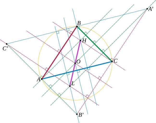 Keywords: De Longchamps point.svg anticomplementary triangle the orthocenter H the circumcenter O and circumscribing triangle and the de Longchamps point L L is the orthocenter of the anticomplementary triangle and the reflection of H across O 2012-09-06 17 41 06 own David Eppstein cc-zero Uploaded with UploadWizard Special points in a triangle Files by User David Eppstein from en wikipedia |