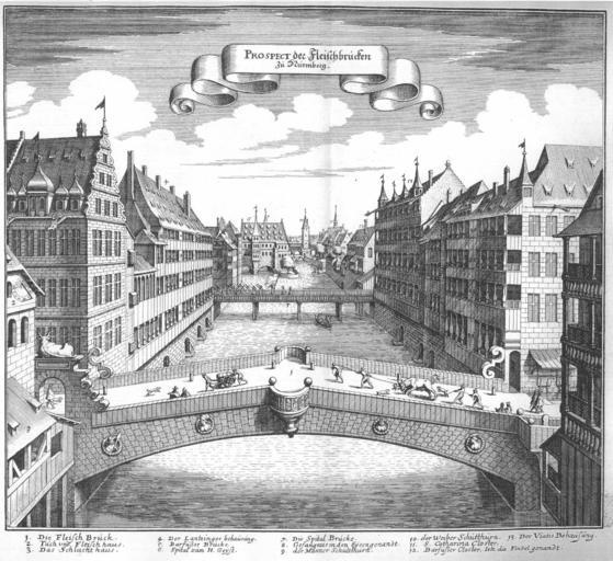 Keywords: De Merian Frankoniae 101.jpg 100 102 D-5-64-000-1074 Engravings of Topographia Franconiae Nuremberg in the 1650s Fleischbrücke Nuremberg Museumsbrücke Nuremberg Fleischhaus Nuremberg-Sankt Sebald