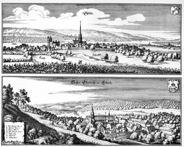 Keywords: De Merian Mainz Trier Köln 027.jpg Upper image Eltville lower image Eberbach monastery close to Eltville 026 028 Eltville am Rhein History of Kloster Eberbach Rhine in Rheingau