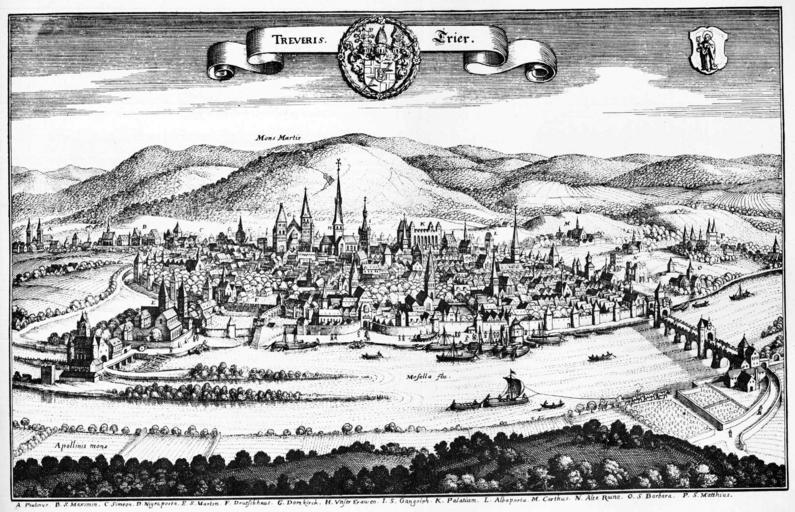 Keywords: De Merian Mainz Trier Köln 045.jpg Trier Stich von 1646 Oben in der Mitte das Wappen des Trierer Kurfürsten Philipp Christoph von Sötern “ Abgebildete Einzelheiten sowie einzeln gespeicherte Bildausschnitte siehe unten <br> Matthäus Merians Stich von 1646 ähnelt stark dem Holzschnitt von Trier von 1548 in Sebastian Münsters Cosmographiae Universalis Titel Situs figura antiquissimae praecipuae Medioniatricum ciuitatis Treuirensis die als die erste authentische Stadtansicht von Trier gilt Zwar ist Merians Ansicht detaillierter als der Holzschnitt bildet aber bauliche Veränderungen die zwischen 1548 und 1646 vorgenommen wurden z B an der Konstantinsbasilika nicht ab Vergleich Kategorie Münster-Holzschnitt Trier und den vollständigen http //historic-cities huji ac il/germany/trier/maps/munster_lat_1550_trier html Holzschnitt in der lateinischen Ausgabe der Cosmographiae Universalis von 1550 auf Historic Cities Trier Germany Engraving from 1646 At the top the coats of arms of the Prince-Elector Philipp Christoph von Sötern For depicted details and cropped versions of this image see below <br> The engraving closely resembles a woodcut from 1548 While providing more details than the woodcut the engraving does not show changes of the view between 1548 and 1646 See Category Münster-Holzschnitt Trier and http //historic-cities huji ac il/germany/trier/maps/munster_lat_1550_trier html the woodcut in a Latin edition of the Cosmographiae Universalis of 1550 on the website Historic Cities 044 046 links lead to the German Wikipedia unless otherwise noted A St Paulin B Abtei St Maximin C St Simeon Simeonstift D deutsch Porta Nigra - English Porta Nigra E Martinskloster monastery of St Martin F Deutschordenskommende G Trierer Dom H Liebfrauenkirche I St Gangolf K Konstantinbasilika L Porta Alba probably refers to the city gate Alttor in the Kaiserthermen M Karthäuserkloster St Alban N Barbarathermen O St Barbara P Benediktinerabtei St Matthias other versions details of the original image are found as<br> Image St Paulin Stich von Merian jpg St Paulin at the far left side of the engraving Image St Paulin und St Maximin Stich von Merian mit Stadtmauer jpg St Paulin and St Maximin with a part of the defensive walls of Trier Image St Paulin und zentral St Maximin Stich von Merian mit Stadtmauer jpg St Paulin and St Maximin with a part of the defensive walls of Trier focussing more on St Maximin Image Roman Bridge Trier 1646 jpg Image Martinskloster De Merian Mainz Trier Köln 1646 jpg Monastery of St Martin image Wappen Philipp Christoph von Sötern De Merian jpg coat of arms on top of the engraving image Oerentor Trier 1646 1548 jpg city gate Oerentor Merian-Stich Trier Bridges in Trier Derivatives of the Coat of arms of Sötern family Derivatives of the Coat of arms of Trier diocese |
