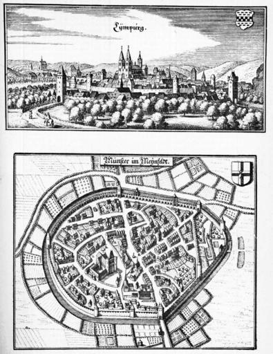 Keywords: De Merian Mainz Trier Köln 065.jpg Upper image Limburg/Lahn - Lower image Münstermaifeld Limburg an der Lahn in the 17th century Historic views of Limburg an der Lahn Münstermaifeld Coats of arms from Limburg an der Lahn 064 066
