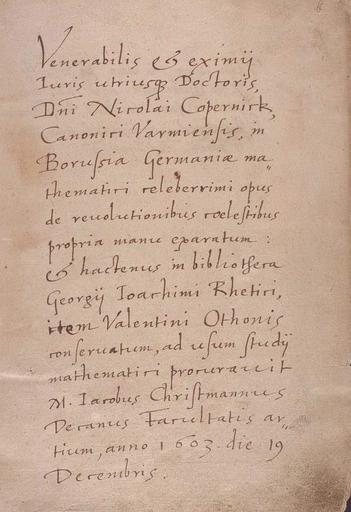 Keywords: De Revolutionibus manuscript br.jpg Artwork en De revolutionibus p b recto pl De revolutionibus s b recto ink paper cm 28 19 213 leaves Kraków Institution Jagiellonian Library en Note by Jakob Christmann in Nicolaus Copernicus' manuscript of De revolutionibus orbium coelestium Venerabilis et eximii iuris utriusque doctoris Domini Nicolai Copernick Canonici Varmiensis in Borussia Germaniae mathematici celeberimi opus de revolutionibus coelestibus propria manu exparatum et haectenus in biblioteca Georgii Ioachimii Rhetici item Valentini Othonis conservatum ad usum studii mathematici procurauit M Iacobus Christmannus Decanus Facultatis artium anno 1603 die 19 Decembris Object history ProvenanceEvent 1543 transfer Tiedemann Giese bishop of Chełmno ProvenanceEvent 1554 transfer Georg Joachim Rheticus in Košice ProvenanceEvent 1574 transfer Valentinus Otho in Heidelberg ProvenanceEvent 1603 transfer Jakob Christmann in Heidelberg ProvenanceEvent 1614 transfer Jan Amos Komenský ProvenanceEvent 1667 transfer Otto von Nostitz in Jawor Śląski ProvenanceEvent 1675 transfer Nostitz family in Prague ProvenanceEvent 1945 transfer National Museum Library in Prague ProvenanceEvent 1956 transfer Jagiellonian University in Cracow gift of the the government of Czechoslovakia http //www bj uj edu pl/bjmanus/revol/images/br jpg www bj uj edu pl 10 000 1520-1541 Nicolas Copernicus Copyright expired PD-Art Other versions PD-old-100 De revolutionibus manuscript |
