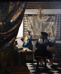 Keywords: De Schilderkunst.jpg File Jan Vermeer van Delft 011 jpg Artwork Creator Johannes Vermeer LangSwitch Die Malkunst <ref>http //bilddatenbank khm at/viewArtefact id 2574 KHM Bilddatenbank </ref> The Art of Painting De schilderkunst Alternate titles Die Künstlerwerkstatt <ref>http //www dhm de/gos-cgi-bin/linz/satz cgi Objekt li001103 Datenbank Sammlung des Sonderauftrages Linz Datenblatt li001103 </ref> ~ 1666-1668 oil canvas cm 120 100 Kunsthistorisches Museum object history Provenance Catharina Bolnes ca 1631-1688 ProvenanceEvent 1676-02-24 conveyance Maria Thins ca 1593-1680 Delft Gerard van Swieten 1772 Vienna Gottfried van Swieten 1803 Vienna - 1803 1813 LangSwitch the estate of de erven Gottfried van Swieten ProvenanceEvent 1813 purchase Johann Rudolf Graf Szernin 1757-1845 Pieter de Hooch Gräflich Czerninsche Galerie Vienna ProvenanceEvent 1940 acquisition Adolf Hitler 1889-1945 Führermuseum 1096a Linz by 1945 Central Collecting Point 1284 Munich GG_9128 Vienna Transferred from nl wikipedia GG_9128 Other versions <table style background-color EEEFFF > <tr> <td> 500x120px none none span </td> <td valign top > File Jan Vermeer van Delft 011 jpg<br />Version from 10 000 Meisterwerke der Malerei</td> </tr> </table> PD-old-100 LangSwitch Hinweis References Notes Noten <references /> original upload log page nl wikipedia De_Schilderkunst jpg 2006-06-19 16 51 LemmingS 1100×1287× 125797 bytes <nowiki></nowiki> ImageNote 1 881 985 87 38 1714 2078 2 LangSwitch Bezeichnet Signed Signé Gesigneerd I Ver-Meer ImageNoteEnd 1 ImageNote 2 774 395 784 59 1714 2078 2 LangSwitch Inschrift Inscription Inscriptie NOVA XVII PROVINCIARUM GERMAINIAE INFERIORIS DESCRIPTIO / ET ACCURATA EARUNDEM DE NOVO EMENDATA RECTISSIME EDITA PER NICOLAUM PISCATOREM ImageNoteEnd 2 The Art of Painting by Johannes Vermeer Leo Belgicus |