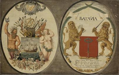 Keywords: De wapens van de VOC en Batavia Rijksmuseum SK-A-4643.jpeg nl De wapens van de Verenigde Oost-Indische Compagnie en van de stad Batavia Het wapen van de VOC toont een zeilend schip op zee; links van het wapen staat Neptunus rechts Amphitrite of een zeemeermin met een spiegel Onderaan een festoen van schelpen bovenaan wapens vaandels nautische instrumenten en attributen van de zeevaart Het wapen van Batavia toont een zwaard bekroond met een lauwerkrans aan weerszijden leeuwen bewapend met de zeven pijlen en een zwaard het geheel omsloten door twee gekruiste palmtakken Het opschrift memoreert de verovering van de stad Jacatra op de Engelsen en Bantammers op 30 mei 1619 Onderdeel van de collectie heraldische objecten ; Jeronimus Becx werkzaam ca 1649 “1658 olieverf op paneel 1651 drager Height cm 63 drager Width cm 97 exhibition history Institution Rijksmuseum object history Acquisition 1874 object type heraldisch object PD-US PD-old-100 Data and photography rights All data and all images made available through the API are either in the public domain or are subject to a CC0 license https //www rijksmuseum nl/en/api/terms-and-conditions-of-use cc-zero place of creation http //www rijksmuseum nl/collectie/SK-A-4643 De wapens van de VOC en Batavia Q17340464 Uploaded with GWToolset De wapens van de VOC en Batavia Rijksmuseum SK-A-4643 http //www rijksmuseum nl/media/assets/SK-A-4643 Images uploaded by Fæ Images from the Rijksmuseum Dutch Golden Age paintings in the Rijksmuseum Amsterdam Jeronimus Becx II |