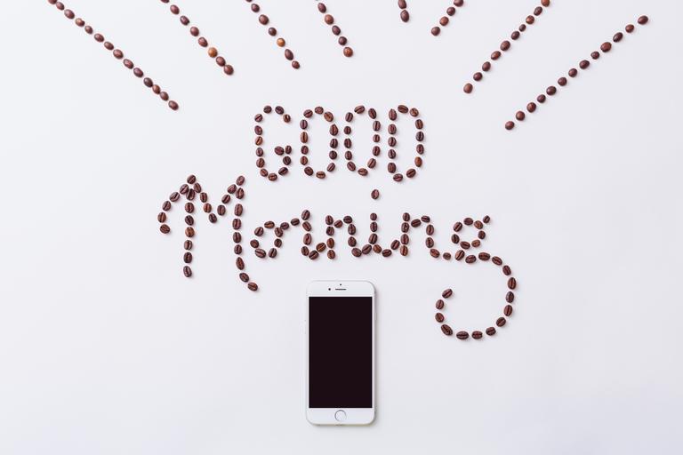 Keywords: dts stock photo text writing white background Good morning banner with coffee beans and smartphone Good morning banner with coffee beans and smartphone