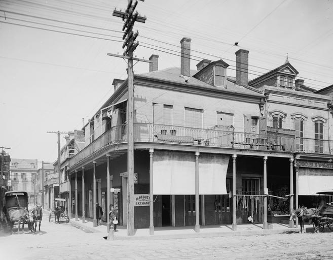 Keywords: DecaturMadisonBeguesExchange.jpg LargeImage New Orleans View of Madison Street looking lakewards from Decatur towards Chartres with Begue's Exchange Restaurant visible on corner Detroit Publishing Company photo via Library of Congress website http //loc gov/pictures/item/det1994009111/PP/ 1906 Photographer not credited PD-Detroit Decatur Madison Streets New Orleans 1906 Black and white photographs of the French Quarter |