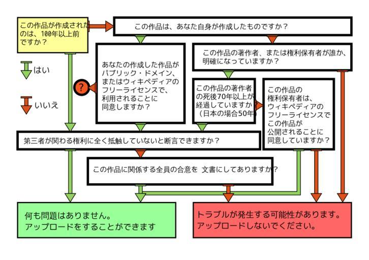 Keywords: Decision Tree on Uploading Imagesv2 ja.svg Decision Tree on Uploading Images Entscheidungsbaum für den Upload von Bildern nach Commons Árbol de decisión para subir imágenes アップロード可否決定の早見チャート Drzewo decyzyjne przy przesyłaniu plików na Commons wersja angielska 上傳 片決策樹 the derivative work JA version from Image Decision Tree on Uploading Imagesv2 svg 2008-08-17 Stefan Lew based on work of WolfgangW Translation in Japanese by SantaClaus This image is public domain You may use this image for any purpose including commercial see gallery Handling Images in commons/Copyright tutorial Wikipedia decision diagrams |