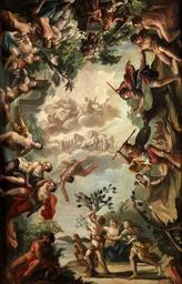 Keywords: Deckengemälde Bozzetto 18Jh Jagd.jpg Bozzetto zu einem Deckengemälde wohl eines Jagdschlosses <br> Motive Zeus mit dem Adler und Juno mit dem Pfau darunter der Sonnenwagen des Musengottes Apoll; Apollo und Daphne mythologische Jagd; Steinsockel mit Blumenvase und Amoretten die die Jagdhunde der Diana anbinden; Diana im Bade; Diana von Aktaion belauscht; ein Flussgott oil on canvas 75 x 47 cm http //hampel-auctions com/ Hampel Auctions ~ 1740 follows shortly PD-old-100 Baroque paintings Hunting in art Paintings of Apollo and Diana Paintings of Diana and Actaeon Daphne mythology 1740s mythological paintings 18th-century paintings location missing 1740s oil on canvas paintings 18th-century paintings not categorised by year Diana after antiquity Paintings of hunting Diana Images from Hampel Auctions |