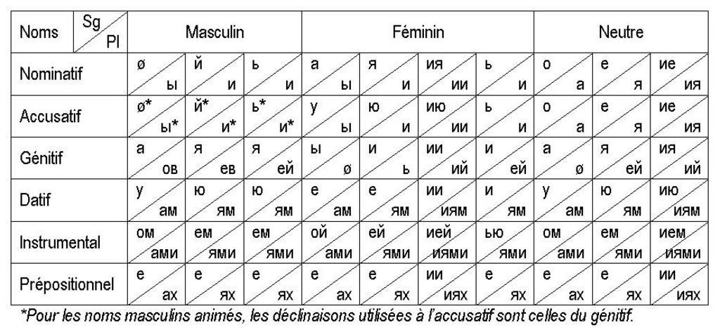 Keywords: Déclinaison noms russes.jpg fr Tableau de déclinaison des noms réguliers en russe own Matban 2009-09-27 no prior publication Tables information