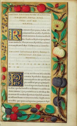 Keywords: Decorated Text Page - Google Art Project (6807970).jpg A text page from the Getty Epistles demonstrates the profound influence of the aesthetics of printed books on manuscripts of the 1500s The page opens with a rubric centered and written in spacious square capitals INCIPIT ARGUMENTUM IN EPISTOLAM BEATI PAULI APOSTOLI AD ROMANOS The prologue of Saint Paul's letter to the Romans follows introduced by a large initial R within a square field Square capitals in gold announce the main text in another rubric and a large initial P begins the body of the letter Italian printed books of the time which featured more space between words paragraphs and different sections than was traditional in earlier manuscripts inspired the spaciousness of this presentation and the styles of script including the large initials The border design with fruits and flowers shows the influence of contemporary Flemish manuscript illumination None 430703 Unknown /collection/the-j-paul-getty-museum/artwork/decorated-text-page-unknown/6807970/ Unknown illuminator /collection/the-j-paul-getty-museum/ The J Paul Getty Museum 343005 http //www getty edu/museum 3/12/2012 5 16 39 PM /collection/the-j-paul-getty-museum/artwork/decorated-text-page-unknown/6807970/ 1520 about 1520 - 1530 Flowers Tempera colors and gold paint on parchment 165 6807970 True 1530 3/25/2012 9 33 55 AM lido getty edu-gm-obj110058 http //www getty edu/art/gettyguide/artObjectDetails artobj 110058 http //www getty edu/legal/copyright html Folio 1520 1540 Paris France Creation w103 x h165 cm about 1520 - 1530 False 0 615234375 Part decorated-text-page-unknown Decorated Text Page d 103 Tempera colors and gold paint on parchment Flowers http //www getty edu/legal/copyright html special url_id DwESh7sIFzrQ6g PD-old-100 MS LUDWIG I 15 Getty museum - Getty Epistles Google Art Project works by unknown artist Fruits in medieval miniatures |