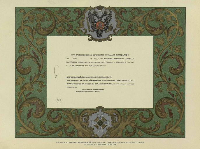 | Keywords: Decoration for services in land reform (certificate).jpg ru Рисунок г амоты выдаваемой к естьянам пожалованным Знаком отличия за т уды по землеуст ойству 1912 К аткий оче к за десятилетие 1906-1916 / Ком по землеуст оительным делам Пет ог ад 1916 author Custom license marker 2013 10 06 PD-RusEmpire Uploaded with UploadWizard Orders decorations and medals of the Russian Empire Stolypin land reform | ||||