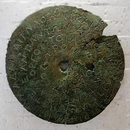| Keywords: Decree Triphylians Louvre Br4069.jpg Decree of the Triphylians granting citizenship and immunity from all obligations to three named persons Pyladas Gnathon and Pyrus and their issue Bronze disc bearing a clockwise spiral inscription beginning at the circumference in Elean dialect Décret des Triphyliens accordant la citoyenneté et l'exemption de charges à trois personnages dont les noms sont mentionnés Pyadas Gnathon et Pyrus Disque de bronze percé d'un trou au centre portant une inscription en dialecte éléen en spirale dans le sens des aiguilles d'une montre à partir de la circonférence century 4 BC bronze cm 13 1 Museum Louvre Department of Greek Etruscan and Roman antiquities Sully first floor room 32 object history probably from Krestena near Olympia provenance probablement Krestena près d'Olympie credit line Purchase 1899 accession number Br 4069 P J Rhodes and R Osbourne Greek Historical Inscriptions 404-323 BC no 15 B Marie-Lan Nguyen 2011 PD-old other versions Greek antiquities in the Louvre - Room 32 |