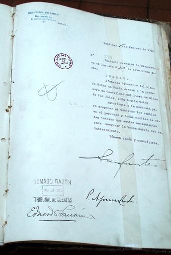 Keywords: DecretoGabrielaMistral.JPG Decreto del Presidente de Chile Juan Luis Sanfuentes con la firma del Ministro de Justicia e Instrucción Pública Pedro Aguirre Cerda por el cual se designa a Lucila Godoy Gabriela Mistral como Directora del Liceo de Niñas de Punta Arenas En el Archivo Nacional de Chile Own 12-3-2007 Ricardo Hevia Kaluf Juan Luis Sanfuentes Pedro Aguirre Cerda Gabriela Mistral |