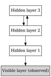 Keywords: Deep belief net.svg deep belief net own Qwertyus 2013-12-25 Created using en Graphviz source <source lang dot > digraph rankdir TB node shape rectangle ; / top two layers form an undirected graphical model / subgraph cluster_top color white rankdir BT h3 label Hidden layer 3 h2 label Hidden layer 2 h3 -> h2 h2 -> h3 h1 label Hidden layer 1 v label Visible layer observed style filled h2 -> h1 h1 -> v </source> Neural networks Cc-zero |