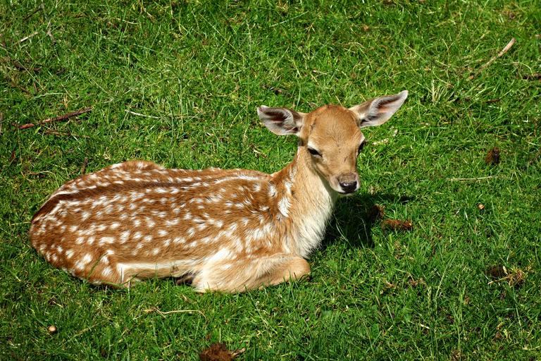 Keywords: deer deer calf doe bambi female young animal mammal baby baby deer cute endearing park deer-park ears spotted grass green