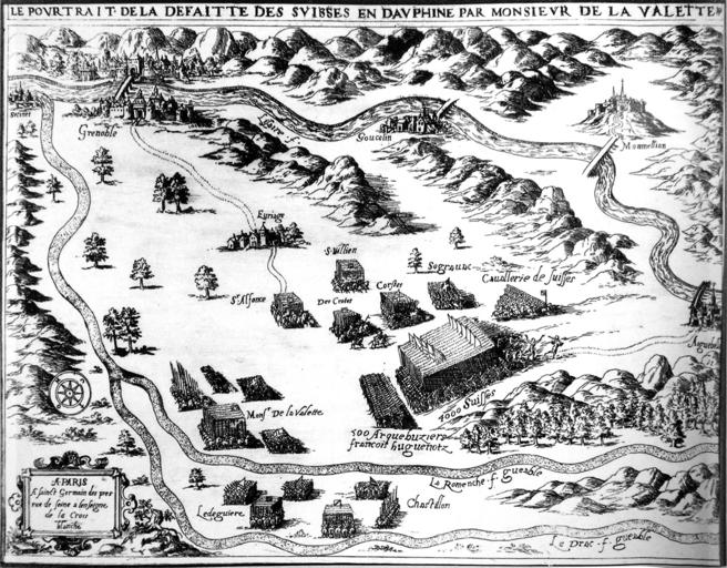 Keywords: Defaitte des Suisses en Dauphiné.jpg Artwork LangSwitch map representing positions during a battle carte représentant un ordre de bataille Date 1899 11 30 Technique engraving black Musée de l'Ancien Évêché de Grenoble place of discovery object history exhibition history credit line full form Le portrait de la défaite des Suisses en Dauphiné par Monsieur de la Valette title recto top fr full form à Paris à Saint-Germain des prés rue de Seine à l'enseigne de la Croix blanche publisher's mark recto bottom left fr LangSwitch the map is taken from an old book la carte est extraite d ™un ouvrage ancien LangSwitch Cropped ™s versions Versions rognées sur Commons <gallery> File Defaitte des Suisses en Dauphiné det 1 jpg File Defaitte des Suisses en Dauphiné det 2 jpg </gallery> accession number place of creation own PD-old cite book Robert Aillaud Robert Aillaud chapter La bataille de Jarrie 19 août 1587 30 cm 978-2-9533-5080-7 Vasti-Dumas 2008 fr Battle of Jarrie Historical images of Isère Drac Romanche River Goncelin Pikemen Historical maps of Grenoble |