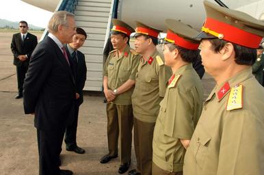 Keywords: Defense.gov News Photo 060604-N-0696M-465.jpg en Secretary of Defense Donald H Rumsfeld speaks with Maj Gen Phan Thanh Lan Director External Relations Department after arriving at Noi Bai Airport in Hanoi Vietnam on June 4 2006 Rumsfeld is in Hanoi to meet with Vietnamese leaders and to visit a U S team investigating the whereabouts of the nearly 2 000 American servicemembers still unaccounted for from the Vietnam War 060604-N-0696M-465 Navy http //www defense gov/photos/newsphoto aspx newsphotoid 8073 2006-06-04 en Petty Officer 1st Class Chad J McNeeley U S Navy PD-USGov-Military-Navy Defense gov news media for June 2006 Import by User Slick-o-bot/Defense gov News Photos Defense gov photos requiring renaming Donald Rumsfeld in 2006 Taken with Nikon D2X |