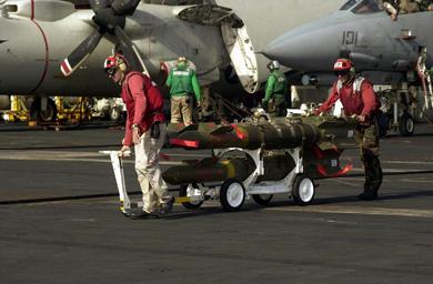 | Keywords: Defense.gov News Photo 011007-N-6520M-034.jpg en Aviation ordnancemen move laser guided bombs to waiting aircraft on the USS Carl Vinson CVN 70 in preparation for strikes against al Qaeda terrorist training camps and military installations of the Taliban regime in Afghanistan on Oct 7 2001 The carefully targeted actions are designed to disrupt the use of Afghanistan as a base for terrorist operations and to attack the military capability of the Taliban regime The USS Carl Vinson CVN 70 is operating in the Arabian Sea as part of Operation Enduring Freedom 011007-N-6520M-034 Navy http //www defense gov/photos/newsphoto aspx newsphotoid 3658 2001-10-07 en Petty Officer 1st Class Greg Messier U S Navy PD-USGov-Military-Navy Defense gov news media for October 2001 Import by User Slick-o-bot/Defense gov News Photos United States Navy in the War in Afghanistan 2001-present War in Afghanistan 2001-present related operations outside of Afghanistan Aboard USS Carl Vinson CVN-70 Operation Enduring Freedom USS Carl Vinson CVN-70 |