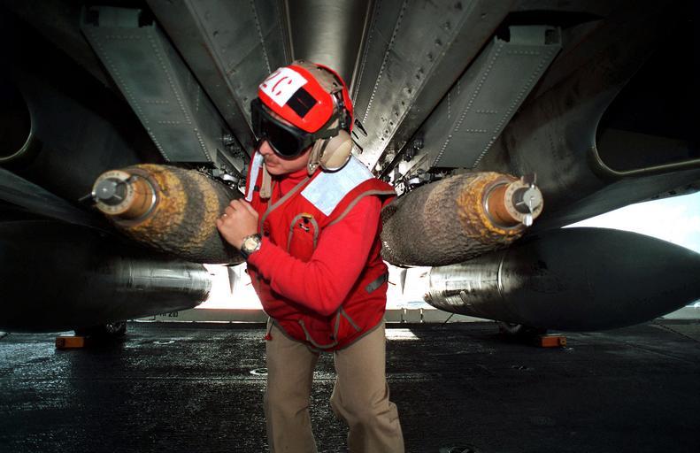 Keywords: Defense.gov News Photo 991206-N-5555T-011.jpg en U S Navy Chief Aviation Ordnanceman Paul K Hillard makes a final inspection of the firing pins of 500-pound bombs mounted underneath an F-14B Tomcat of Fighter Squadron 103 VF-103 Jolly Rogers on the flight deck of the USS Dwight D Eisenhower CVN-69 on 6 December 1999 The Eisenhower and its embarked Carrier Air Wing 7 were operating in the Atlantic Ocean as part of Joint Task Force Exercises in preparation for a six-month deployment to the Mediterranean Sea 991206-N-5555T-011 Navy http //www defense gov/photos/newsphoto aspx newsphotoid 2600 1999-12-06 en Airman Justin K Thomas U S Navy PD-USGov-Military-Navy F-14B Tomcat on flight decks F-14 Tomcat armament Fighter Squadron 103 United States Navy Mark 82 bomb Flight deck of USS Dwight D Eisenhower CVN-69 |