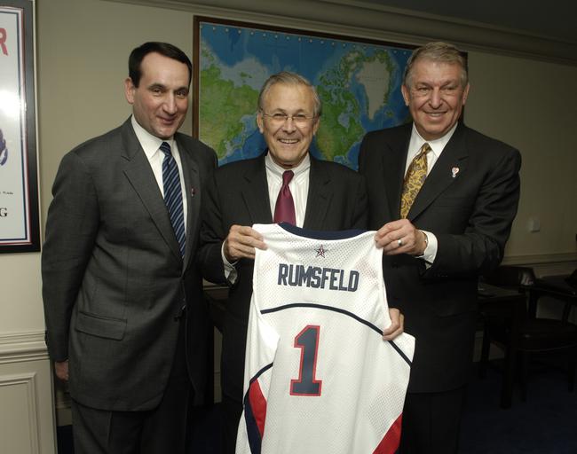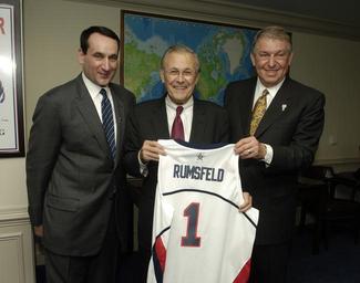 Keywords: Defense.gov News Photo 060406-N-0696M-067.jpg en USA Basketball Men's Senior National Team Head Coach Mike Krzyzewski left and USA Basketball Men's Senior National Team Managing Director Jerry Colangelo right flank Secretary of Defense Donald H Rumsfeld as he is presented a Team USA basketball jersey in the Pentagon in Arlington Va on April 6 2006 Basketball superstars Chris Mullin Chasity Melvin Buck Williams Ruthie Bolton David Robinson Coach Krzyzewski and Coach Chuck Daly are in the Pentagon to hold a special basketball clinic for children of deployed and active duty military members as part of April's National Month of the Military Child 060406-N-0696M-067 Navy http //www defense gov/photos/newsphoto aspx newsphotoid 7856 2006-04-06 en Petty Officer 1st Class Chad J McNeeley U S Navy PD-USGov-Military-Navy Defense gov news media for April 2006 Import by User Slick-o-bot/Defense gov News Photos Defense gov photos requiring renaming Donald Rumsfeld in 2006 Taken with Nikon D2X 2006 in Virginia Mike Krzyzewski Jerry Colangelo Interior of The Pentagon Number 1 on sportswear United States men's national basketball team |