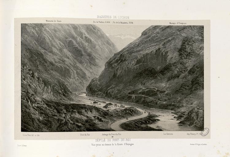 Keywords: Défilé du Pont-du-Roi - Vue prise au-dessus de la Route d'Espagne - Fonds Ancely - B315556101 A PETIT 1 019.jpg Fait partie d'un recueil de 30 lithographies chiffrées de 1 à 30 La lithographie n°16 est sur double page il n'y a pas de lithographie chiffrée 17 Les planches du premier tirage de cette suite imprimées chez Thierry à Paris ont été publiées en 1854 et 1855 L'éditeur de Victor Petit n'est plus celui des précédents recueils Bassy à Pau mais Dulon libraire-éditeur à Bagnères-de-Luchon et à Saintes Dulon publiera ultérieurement à plusieurs reprises des recueils de vues de Luchon et autres sites des Pyrénées par Victor Petit dont la composition est très variable Les planches ne seront plus tirées chez Thierry mais par l'imprimerie J Monrocq à Paris Pièce jointe entre la pl 6 et la pl 7 une pl extraite de Les Pyrénées a été ajoutée Sa légende est la suivante Cirque de Gavarnie - Vue prise du Chemin de la Coumélie Cette planche a été éditée par Dulon mais a été imprimée chez J Monrocq à Paris Ancely René 1876 - 1966 Possesseur fre public domain domaine public B315556101_A_PETIT_1_019 jpg image/jpeg 1 f de pl lithogr ; 26 5 cm oblong Dulon Éditeur Thierry 17 -18 ; imprimeur-lithographe Imprimeur http //numerique bibliotheque toulouse fr/collect/general/index/assoc//ark /74899/B315556101_A_PETIT_1_019 dir/B315556101_A_PETIT_1_019 jpg Bibliothèque municipale de Toulouse A-PETIT 1-18 Creator Victor Jean-Baptiste Petit http //catalogues toulouse fr/web2/tramp2 exe/do_keyword_search/log_in setting_key BMT1 servers 1home query p001931 vignette http //numerique bibliotheque toulouse fr/collect/general/index/assoc//ark /74899/B315556101_A_PETIT_1_019 dir/B315556101_A_PETIT_1_019_thumb jpeg century 19 Défilé du Pont-du-Roi - Vue prise au-dessus de la Route d'Espagne B315556101_A_PETIT_1_019 lithography - print Bridges in Haute-Garonne Victor Jean-Baptiste Petit History of Pyrénées Bridges in art Garonne Mountains in art Roads in art Bagnères-de-Luchon in art Guest houses in France Rivers in art Scanned with i2s Digibook Suprascan 6002 RGB |
