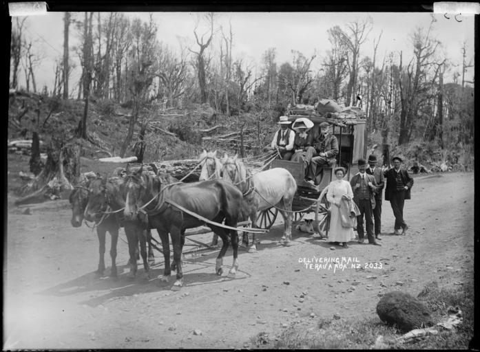 | Keywords: blackandwhite monochrome outdoor photo border black and white Delivering mail, Te Rauamoa, circa 1908, photographed by William Archer Price. Shows a horse drawn carriage on a road and a group of men and women. One of the women holds a mail bag. A dog lies under the carriage. Inscriptions: Inscribed - Photographer's title on negative -bottom right: Delivering mail Te Rauamoa NZ 2033. Quantity: 1 b&w original negative(s). Physical Description: Glass negative Delivering mail, Te Rauamoa. Price, William Archer, 1866-1948 :Collection of post card negatives. Ref: 1/2-001735-G. Alexander Turnbull Library, Wellington, New Zealand. natlib.govt.nz/records/22826564 Delivering mail, Te Rauamoa, circa 1908, photographed by William Archer Price. Shows a horse drawn carriage on a road and a group of men and women. One of the women holds a mail bag. A dog lies under the carriage. Inscriptions: Inscribed - Photographer's title on negative -bottom right: Delivering mail Te Rauamoa NZ 2033. Quantity: 1 b&w original negative(s). Physical Description: Glass negative Delivering mail, Te Rauamoa. Price, William Archer, 1866-1948 :Collection of post card negatives. Ref: 1/2-001735-G. Alexander Turnbull Library, Wellington, New Zealand. natlib.govt.nz/records/22826564 |