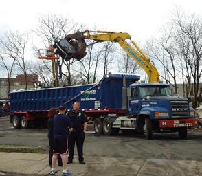 Keywords: Demolition lifting burnt car to waste removal truck.JPG en A giant crane lifts a burnt out car destroyed in a fire to be hauled away in a truck 2013-04-12 22 14 27 own Tomwsulcer cc-zero Uploaded with UploadWizard Demolitions in the United States Excavators in the United States Mack CH600-series Dump trucks in the United States Dump semi-trailer trucks |