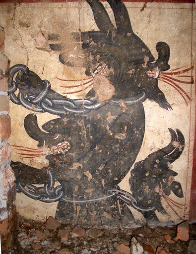 Keywords: Demone Quadricefalo Favria(TO).jpg San Pietro Vecchio church Painter of XIV century Four-heads Demon Favria Turin Italy Own 2007-09-30 Laurom San Pietro Vecchio Favria Frescos in Favria The Devil 14th-century frescos Favria