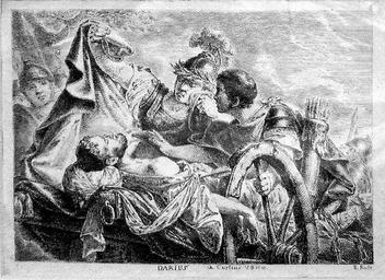 | Keywords: Den Leichnam des Darius.jpg Darius bedeckt Alexander mit seinem Mantel Radierung von Bernhard Rode 1769/70 Darius auf einem Wagen in goldene Fesseln und mit einem Pfeile getodetet Die Tiara ist ihm vom Haupte gefallen Alexander vergießt Tränen über ihn und bedeckt ihn mit seinem Purpurmantel Der griechische Soldat der ihm kurz vor seinem Tode mit einem Trunk Wasser erquickt und den Alexander zu ihm geführt hatte sieht voll Mitleid dass er schon gestorben ist Katalog der Berliner Akademie Ausstellung 1794 3 In Die Kataloge der Berliner Akademie-Ausstellungen 1786-1850 bearb v H Börsch-Supan Bd 1 Berlin 1971 Literarische Quelle Quintus Rufus Curtius Das Leben Alexanders des Großen 5 Buch 13 25 en Alexander Covers the Body of Darius with His Cloak engraving by Bernhard Rode 1769-70 Darius on a wagon in golden shackles and killed by an arrow His tiara has fallen from his head Alexander spills tears over him and covers him with his purple cloak The Greek soldier who succored him with a drink of water shortly before his death and led Alexander to him sees with a look of pity that he has already died Catalog of the Exhibition of the Berlin Academy 1794 3 in Die Kataloge der Berliner Akademie-Ausstellungen 1786-1850 ed by H Börsch-Supan vol 1 Berlin 1971 Literary source Quintus Rufus Curtius The Life of Alexander the Great Book 5 13 eigene Fotografie own photography of a privately owned engraving artwork Creator Bernhard Rode Photo James Steakley engraving 1769-70; photo 2009-01-17 PD-old-100 1770s etchings by Bernhard Rode Quintus Curtius Rufus Engravings of Alexander the Great Darius III |