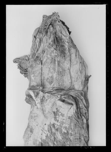 | Keywords: Den yttersta av Gustav II Adolfs Lützenskjortor - Livrustkammaren - 26625.tif LSH artwork sv Rester av skjorta i 3 delar ryggstycke med en bit av kragen v framstycke med kragstycke och större delen av ärmen samt h framstycke med kragens främre halva och en del av bakstycket <br/><br/>1 Ryggstycket med en bit av kragen <br/>Skjortans vådbredd har i h ö sida utökats med en våd av 460 mm som tillför plagget en bredd av 230 mm på resp fram- och bakstycket På ryggsidan är denna fåll gjord som stad mot stad - sammankastad fåll från avigsidan av plagget 7 kaststygn åt v med H-tvinnat lingarn Av denna fåll finns nerifrån kantfållen kvar 350 mm sedan har sannolikt från sprundet klippts och rivits en stor lucka av sömmen saknas 360 mm sedan kommer på nytt ett 630mm långt stycke av kastfållen Okstycket är här blott ett oregelbundet klippt stycke med snedklippt överkant På V sida som rivits av utefter sidfållen - fällsömmen finns blott ytterligare ett stycke av ärmspjället kvar och en liten bit 40 mm av dess söm mot ärmen Spjällets kant är här 150 mm Fållen sydd med h-tvinnat lingarn med 6 stygn /cm och drygt 1 mm bredd Av kragen återstår i underkanten en 145 mm lång bit Upptill blott en 100 mm lång bit där spetsen sytts fast med 8 stygn kast- åt V/cm med H-tvinnat lingarn Kragen är 670 mm hög I kragen har ca 16 rynkor stripats och 7 kaststygn åt H sytts ned på rätan och ca 7 stygn/cm i de tättplacerade parallella garneringssömmarna Hela arrangemanget är ej mer än 3 mm brett H-tvinnatlingarn har använts till garneringssömmarna Den breda uddspetsen med bl a flätslag är 50 mm bred den smala 15 mm Den breda har en rapport av ca 24 mm <br/><br/>2 Ett stycke av skjortans V framsida med kragstycke och större delen av ärmen <br/>Största längd fram är från kragens underkant max 530 mm och 140 mm halssprund finns kvar Här är också vådbredden bevarad mellan halssprund och ärmsöm Av ärmsömmen finns det 290 mm kvar varav 220 ovanför spjället som alltså är bevarat som en 70 mm bred remsa och här är spjället klippt snett ½ våden verkar då att vara 595 à 600 mm bred på v bröstsida Slätt parti fram på axeln är ungefär 200 mm enligt detta stycke att döma Ärmmanschetten är 45 mm bred med stripade veck ca 12 veck/cm och 7 stygn såväl mellan dessa som i de 2 garneringsraderna hela dekorens bredd 3 mm Spetsen är densamma som på kragen Manschettstyckena är mycket blodiga <br/><br/>3 H framstycke fr o m halssprundet med kragens främre halva och en del av bakstycket av kragen hela axelsömmen samt en övre del av ärmen med spjället - som dock har en reva En ände till1150 mm nående remsa finns av skjortans framstycke från axelsömmen räknat Nederst är denna blott 110 mm bred och då den tydligen har klippts av när tyget redan låg veckat är dess kant uddig souvenir Axelsömmen är 160 mm och sneddad så att den är 130 mm vid axeln men krymper till blott ett par mm vid halsen På rätsidan är det ryggstycket som går över framstycket 3 sömmar med 7-8 stygn/cm Det övriga tyget - de ca 420 mm har rynkats samman i kragen till 100 mm Fällsömmen som förenar framstyckets med sidovåden är gjord för att bli särskilt smidig från skjortans insida med 7 kaststygn åt V gjort från rätan över staden Fållen är blott millimeterbred Av kragen finns i nederkanten en 160 mm lång bit I överkanten är den dock inte mycket mer än 130mm från hörnet räknat Längs överkanten står den smala uddspetsen upp och den löper utefter halssprundet mitt fram På kragens horisontella del är från överkanten och nedfallande en bredare uddspets fästad <br/><br/>Gemensamt <br/><br/>Av linnelärft med trådantal 43 varptrådar x 44 inslagstrådar / cm2 sammanfogad av framstycke bakstycke b 1470 mm sidstycke samt ärmar ärmspjäll krage och ärmlinningar I sidorna har nertill ämnats ca 510 mm höga sprund staden är synlig här i v sida Skjortans bålparti är rakt tillskuret Nedtill har skjortan fållats upp med en 15-20 mm bred fåll sydd med 5 à 6 stygn/cm av H-tvinnat lingarn De rektangulärt tillskurna ärmarna blott den v någorlunda bevarad är 610 mm långa och 460 mm breda och garnerade med 3 rader knappt 20 mm breda vita knypplade mellanspetsar påsydda med ca 100 mm mellanrum Ärmarna är fastsydda i skjortans sidsöm på v sida där staderna stöta mot varandra I h sida har man klippt upp ett 390 mm långt sprund för ½ ärmbredden 230 mm + spjäll 160 mm 390 mm Nedanför ärmstycket har alltså ett spjäll med ca160 mm sida sytts fast Ärmarna är alltså isydda helt normalt och inte som Anna Maja Nylén förmodat enligt en mer egendomlig konstruktion så att ärmen skulle nå ända fram till halslinningen <br/><br/>Axelsömmarna är i det allra närmaste helt raka de yttersta 165 mm Man har blott vikt ner fållarna något bredare mot axeln än mot halsen ca 5 mm differens Härefter har ll återstående vidd rynkats in i den dubbelvikta knappt 70 mm håga kragen som är ca 400 mm lång så att frampartierna av skjortorna fördelats på kragens främre decimeterlånga stycken medan ryggstycket rynkats i kragens bakre 200 mm <br/><br/>Halssprundet är klippt upp vertikalt i framstycket l minst 270 mm synligt i h sida där spetsgarneringen bevarats en 15 mm bred uddspets Dessutom kan påpekas att sprundet ej placerats helt symmetriskt mitt på skjortans framstycke utan med ett par centimeters förskjutning åt h då det klippts ca 600 mm från v sidsöm och 230 + 350 580 mm från h sida Dekor av en 15 mm bred uddspets rapport 20 mm Överst på kragen är denna typ av spets fastsydd för att stå upp som en avslutande kant På kragens utsida är kant i kant med den smala spetsen och nedåt en bredare uddspets fastsydd Denna är 50 mm bred och har en rapport av 22 mm motivet påminner om solfjädrar <br/><br/>Kragens garneringssömmar sydda med efterstygn i 2 parallella rader med 7 stygn/cm och 16 rynkor a