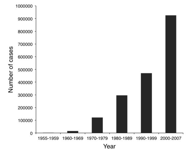 Keywords: Dengue case number.png en Average anuual number of DF cases and DHF cases reported to WHO 1955-2007 http //apps who int/iris/bitstream/10665/44188/1/9789241547871_eng pdf WHO 2009 p 4 ja WHOに報告されたデング熱およびデング出 熱の年間平 件数 http //apps who int/iris/bitstream/10665/44188/1/9789241547871_eng pdf WHO 2009 p 4 2016-05-09 own Karasunoko other versions cc-zero Dengue |