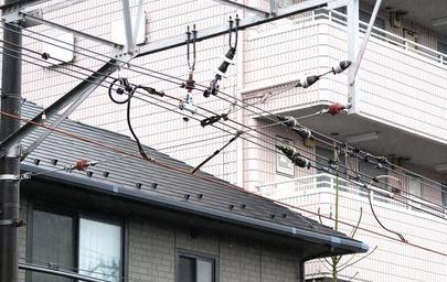 Keywords: Densyasenkubun NO2.JPG ja 電車線区分標付近での電車線の様子 電気を 電する為電車線同士が電線で繋がっている (公道から撮影) 投稿 が撮影 toshinori baba 2011-03-23 Cc-zero Overhead lines