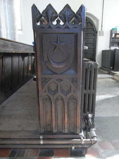 Keywords: DenzellArmsBenchEndWeareGiffardChurchDevon.jpg en Heraldic bench-end c 1510 Weare Giffard Church Devon showing arms of Denzell family Sable a crescent in base and a mullet in chief argent own photo Sculpture by unknown artist c 1510; own photo ~ 1510 Holy Trinity church Weare Giffard Bench ends Interiors of churches in Devon Reliefs of coats of arms in England |