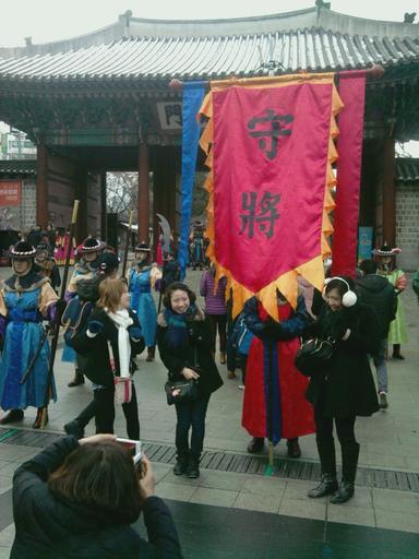 | Keywords: Deoksugung Changing of the Guard Reenactment - tourist.jpg en Reenactment of changing of the palace guards during Joseon dynasty After reenactment finished foreign tourists maybe Japanese are taking picture with the commander role own Self-made 20113-12-19 Deoksugung |