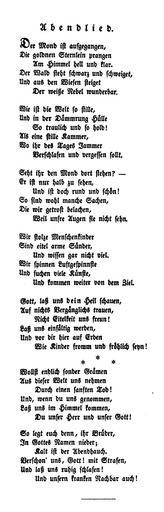 Keywords: Der Mond ist aufgegangen (1774).jpg de Matthias Claudius Der Mond ist aufgegangen 1774 Asmus omnia sua secum portans oder Sämmtliche Werke des Wandsbecker Boten Band 4 S 57-58 http //books google de/books id plYmAAAAMAAJ printsec frontcover hl de source gbs_ge_summary_r cad 0 v onepage q f false Matthias Claudius 1774 Der Mond ist aufgegangen PD-old-100 |