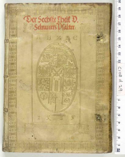 Keywords: Der sechste theil des Psalters Dauids, aussgelegt, vnd auffs newe vbersehen, durch Nicolaum Selneccerum. -126-150.- - Upper cover (c108d29).jpg Style Armorial Panel design Lettered cover eg intitals titles Dated; Caption Upper cover; Colour White / cream; Edge Unspecified exhibition history Decorative Technique Tooled in gold Printed/other transfer process; Cover Material Parchment may include vellum Traces of 2 pairs of ties With the arms and initials of Augustus I Elector of Hanover dated 1585 Title in red Vellum flap extends over fore edge Macchi states; bound in 1585 in Saxony by Caspar Meuser C Schmidt Jakob Krause pl 74 1 st line 1 st Meuser panel-stamp Saxony 13 compartments A very similar example is owned by the Landesbibliothek Dresden on Bericht Wie die Tabeln in Beschickung der Golder auff Rheinisch Gulden zu 18 Karatt 6 gren goldt haltend Und der Zursatz mit Weiss oder Roth gebraucht werden sollen ms about 1585 shelfmark Mscr J 354 Deutsche Bucheinbände der Renaissance n 89 This kind of cover corresponds to the medieval ledger binding First at August Kurfürst court the manuscript or printed text were chosen and the binding richly decorated During Meuser's time texts were bound according to this style and thought of as traveling library this explains the tendency to use a richer decoration The red title also present on the Dresden example disturbs the general layout it seems therefore possible that it was added later to the owner's order The little azured border medallions shows the French influence decoration The same panel-stamp was tooled in blind on Johannes Claius Grammatica Germanicae Linguae Leipzig Hans Rambau 1578 Berlin National Library shelfmark Y 3931 Deutsche Bucheinbände der Renaissance n 89 object history Text 1585; Dresden; August I Elector of Hanover object type Cc-zero place of creation Binding Germany place of discovery Unspecified British Library image http //www bl uk/catalogues/bookbindings/LargeImage aspx RecordId 020-000004540 ImageId ImageId 41875 Copyright BL Der sechste theil des Psalters Dauids aussgelegt vnd auffs newe vbersehen durch Nicolaum Selneccerum 126-150 Uploaded with GWToolset Der sechste theil des Psalters Dauids aussgelegt vnd auffs newe vbersehen durch Nicolaum Selneccerum 126-150 - Upper cover c108d29 http //www webarchive org uk/bldatasets/bindings/6448_4 jpg Bookbinding 16th-century bookbinding British Library Bookbindings |