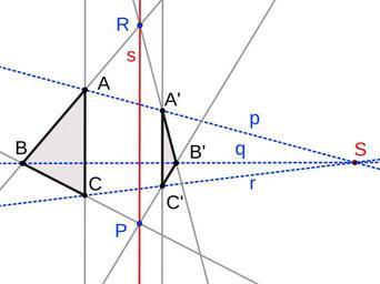 Keywords: Desargues affine.svg en Desargues theorem with one of the 3 collinear points at infinity fr théorème de Desargues avec un des 3 points alignés à l'infini own using geogebra inkscape and scour Proz Cc-zero Desargues' theorem